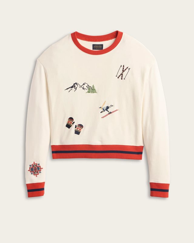 This cozy French terry pullover is designed with exclusive Pendleton ski-inspired graphics, adding a playful nod to winter heritage. The relaxed fit and ribbed crewneck, cuffs, and hem make it an easy layer for weekends or après-ski lounging. Soft cotton construction ensures comfort and lasting wear.